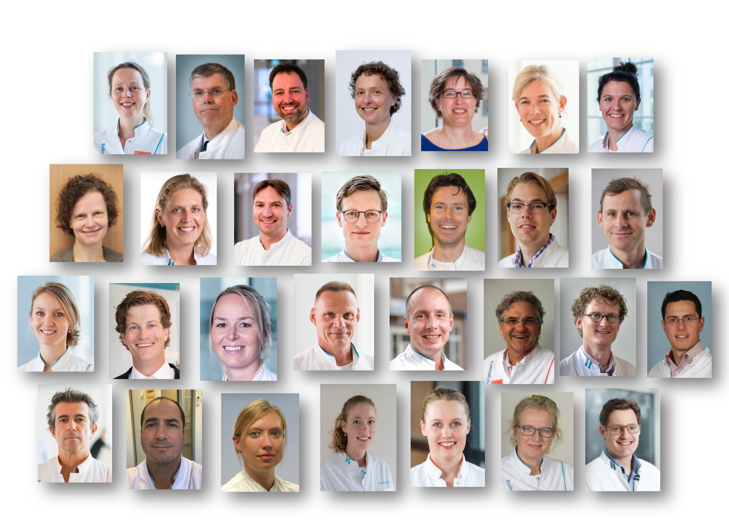 Vierde rij: Prof Dr I Malagon, kinderanesthesioloog, Dr T Geeraedts, interventieradioloog, Dr I vd Geest, orthopeed, Dr V Harbers, postdoc & arts-onderzoeker, Drs F Bouwman, onderzoeksarts, L Rijken, bandagist, Dr W Weijs, MKA-chirurg
